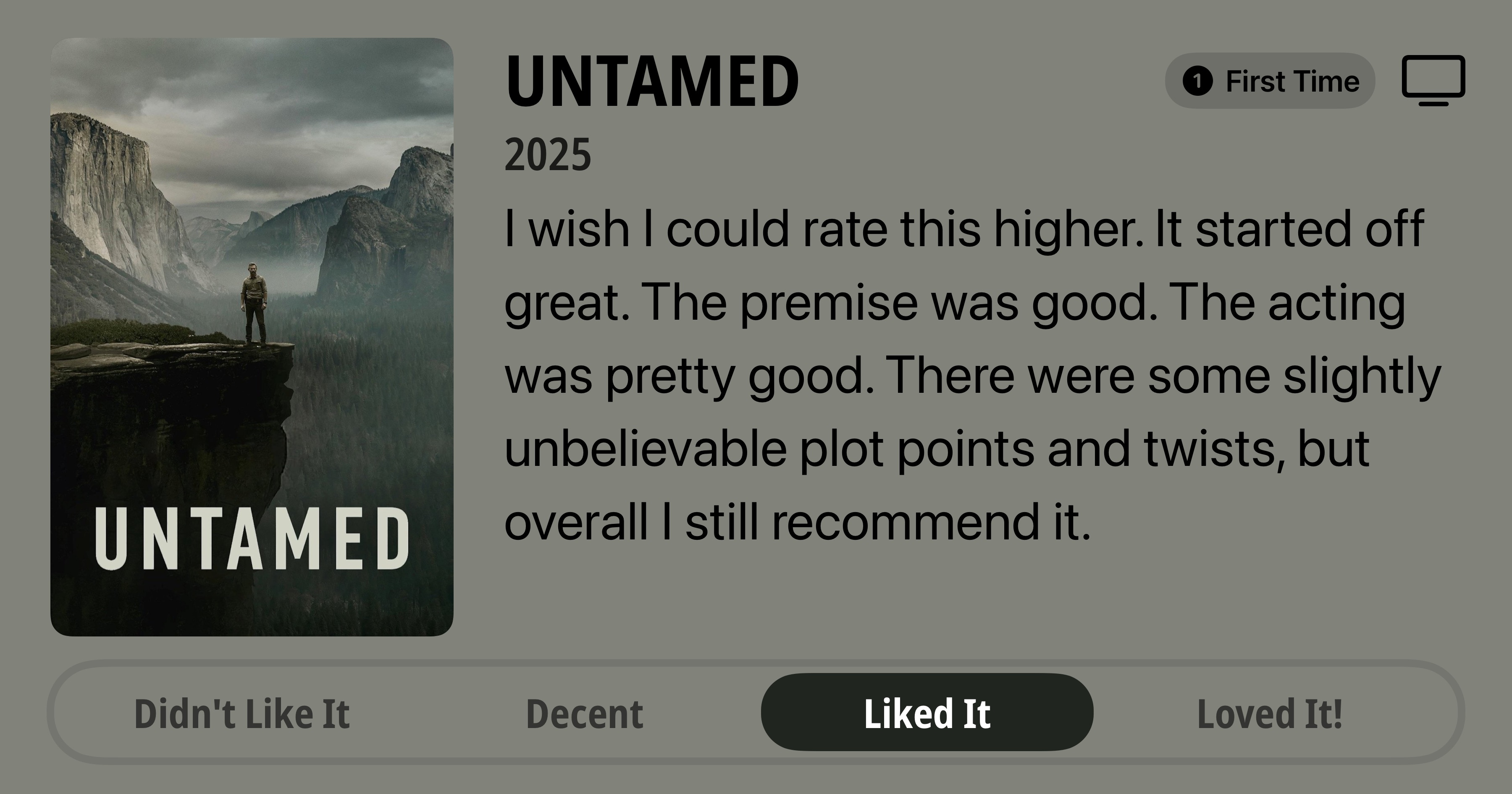UNTAMED • First Time Watch • 2025 • I wish I could rate this higher. It started off great. The premise was good. The acting was pretty good. There were some slightly unbelievable plot points and twists, but overall I still recommend it. • Liked It