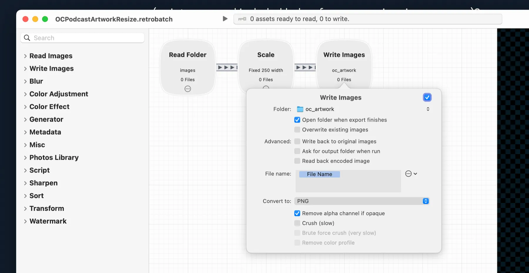 Because the image URL for the artwork always contains https://public.overcast-cdn.com/art/, it’s always a simple thing to find it with a regular expression and then download that file. I name the artwork files as the Overcast episode ID with a UUID appended. I save those to a folder for processing by Retrobatch.