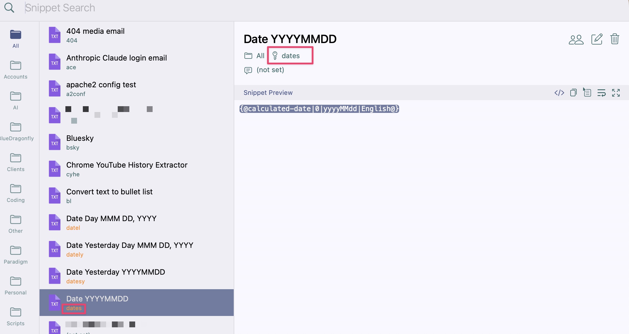 Below you can see that I have a date snippet called Date YYYYMMDD which generates a datestamp for me with today’s date in the year month date format like this: 20251101. That’s 2025, month 11, day 1 (it is indeed the 1st of November, 2025, as I write this.) You can also see that I have a key set for it which is the word “dates” (standing for date short).