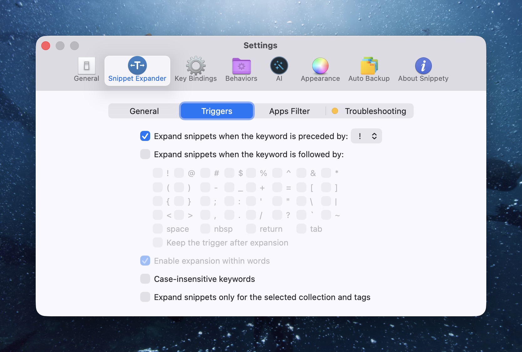 Popping Snippety open and inserting things this way is great, but you can also use it as a text expander. Snippety lets you set a key for any snippet, which is a great way to search for them in the Snippety UI, but also works as a text expansion trigger when combined with whatever character you have set as the text expansion trigger in Snippety Settings.