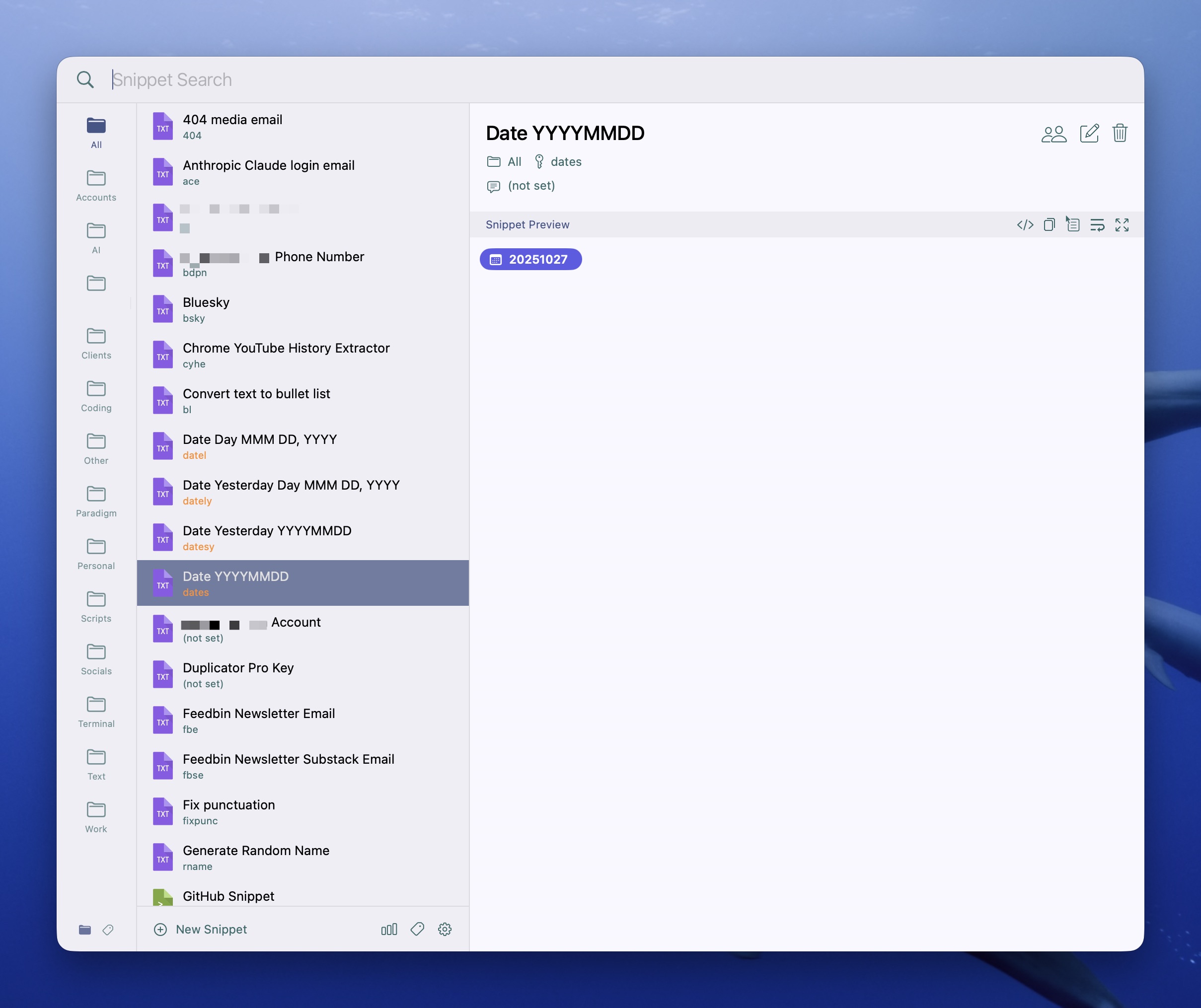 Because I have my Snippet Expander Trigger character set to be a preceding ”!” character, now whenever I type the string “!dates”, it expands out into today’s date written as YYYYMMDD. I used it above to show the output of today’s date written this way, which is 20251101. There, I just used it again!