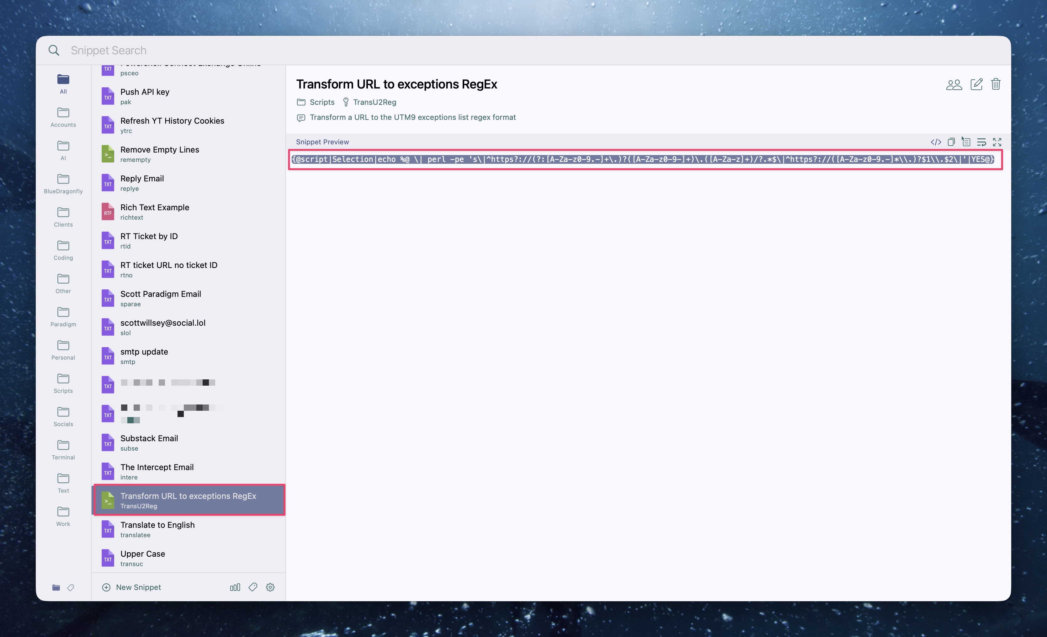 In Snippety, you can run command line commands that run the command and give you the output as the snippet. For example, I have a snippet called “Transform URL to exceptions RegEx” which I use when I want to take a URL I’m given by someone and convert it into a specific regular expression that I put in a firewall block exceptions list. You can see the big long command in the snippet below: