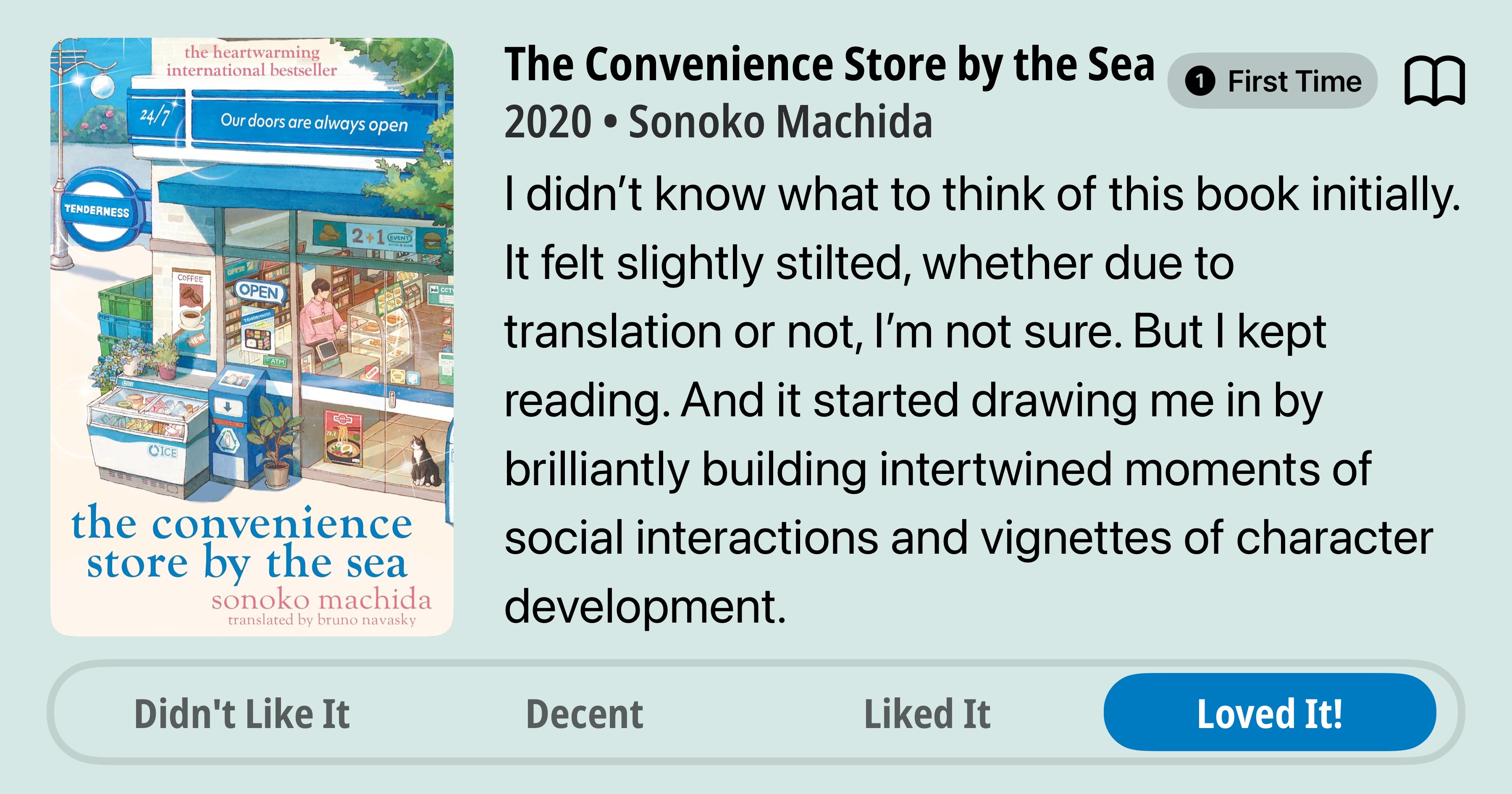 The Convenience Store by the Sea • First Time Read • 2020 • Sonoko Machida • I didn’t know what to think of this book initially. It felt slightly stilted, whether due to translation or not, I’m not sure. But I kept reading. And it started drawing me in by brilliantly building intertwined moments of social interactions and vignettes of character development. • Loved It!