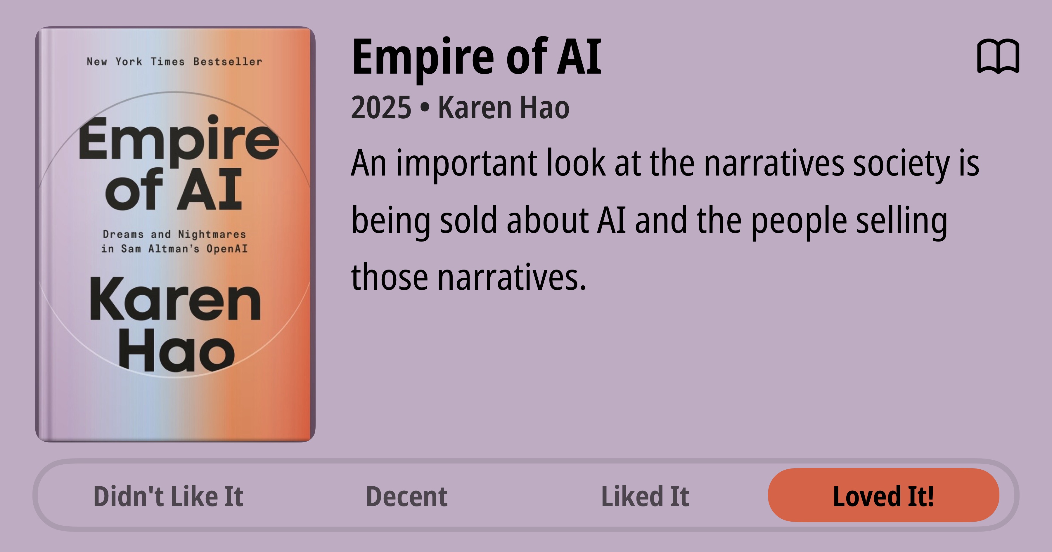 Empire of AI • 2025 • Karen Hao • An important look at the narratives society is being sold about AI and the people selling those narratives. • Loved It!