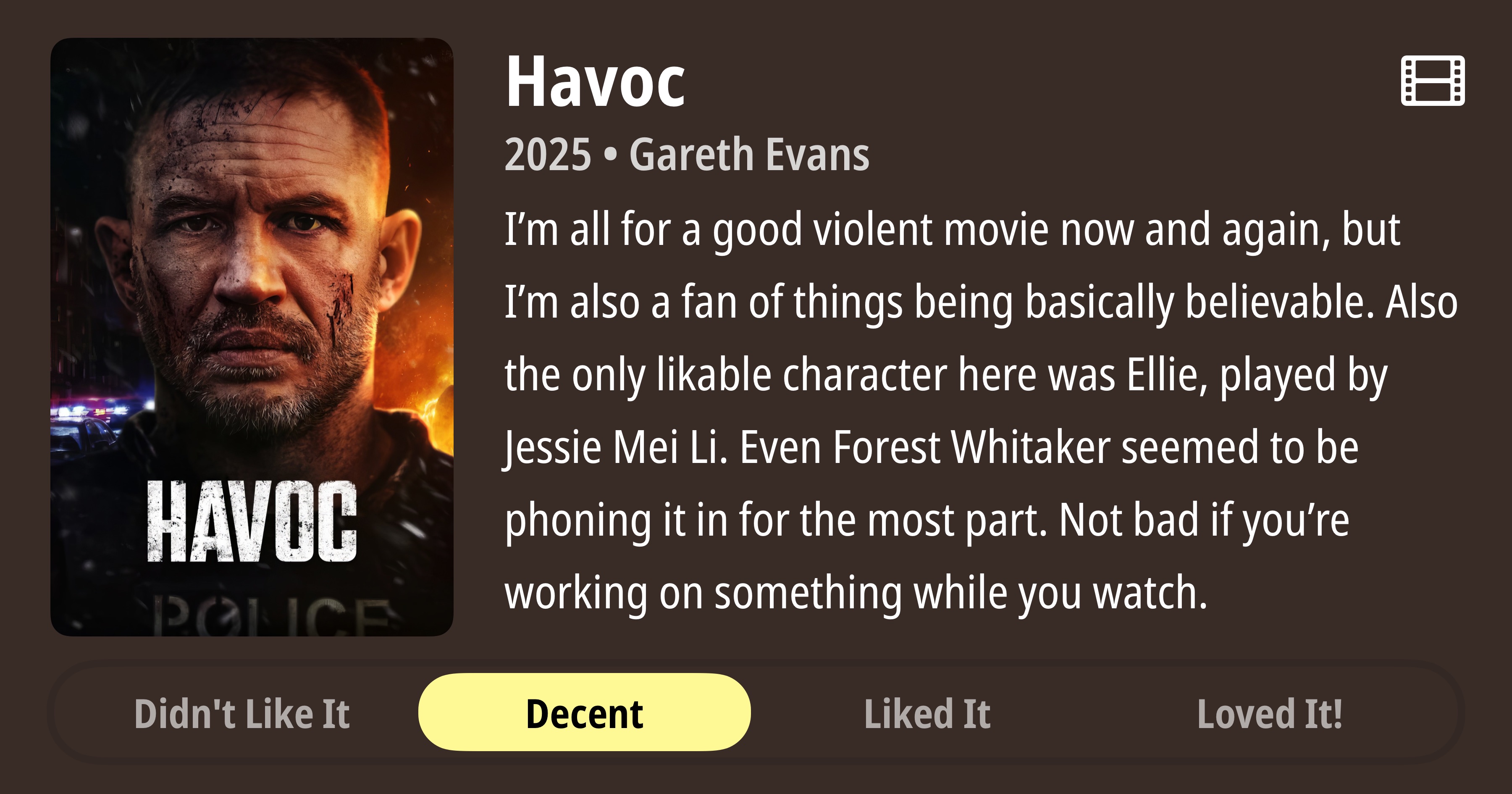 Havoc • 2025 • Gareth Evans • I'm all for a good violent movie now and again, but I'm also a fan of things being basically believable. Also the only likable character here was Ellie, played by Jessie Mei Li. Even Forest Whitaker seemed to be phoning it in for the most part. Not bad if you're working on something while you watch. • Decent
