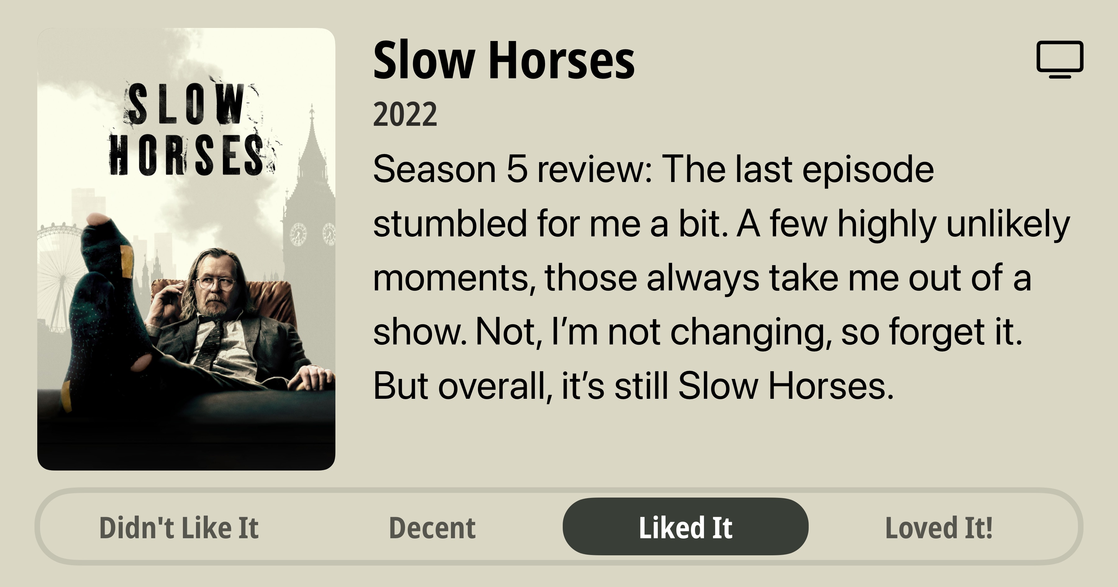 Slow Horses • 2022 • Season 5 review: The last episode stumbled for me a bit. A few highly unlikely moments, those always take me out of a show. Not, I'm not changing, so forget it. But overall, it's still Slow Horses. • Liked It